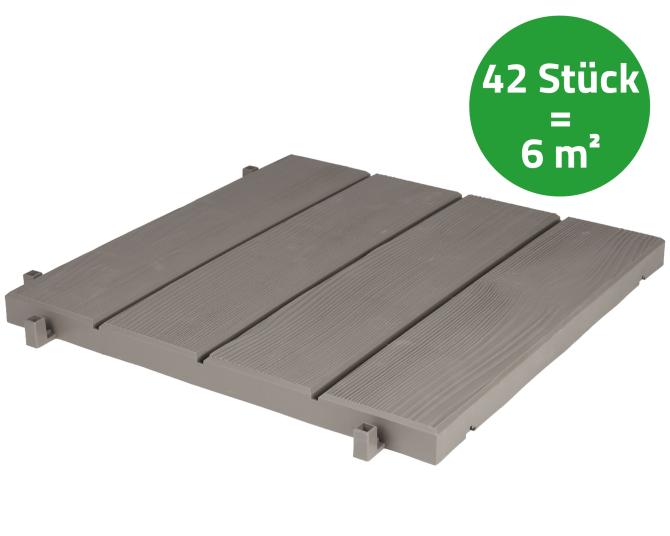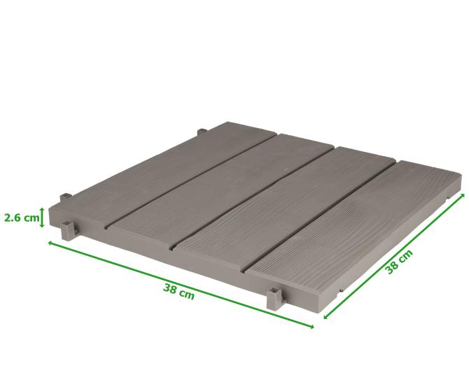 Die Bodenplatten lassen sich ganz einfach und schnell selbst verlegen. Das Deckmaß je Platte beträgt hierbei ca. 38 x 38 cm. In wenigen Schritten entsteht ein schicker Hingucker – und das auf fast allen Untergründen.
