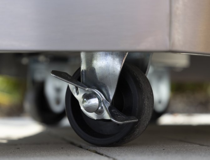 Dank der zwei 3"-Bockrollen und zwei 3"-Feststell-Lenkrollen ist dieser Schrank nicht nur leicht zu bewegen, sondern auch sicher zu fixieren. Ob Sie ihn flexibel in Ihrer Outdoor-Küche verschieben oder an einem festen Platz arretieren möchten – er passt sich ganz Ihren Wünschen und Bedürfnissen an. Perfekte Mobilität trifft hier auf Stabilität.