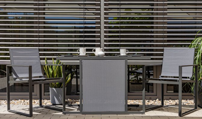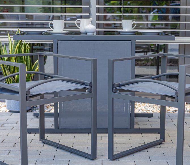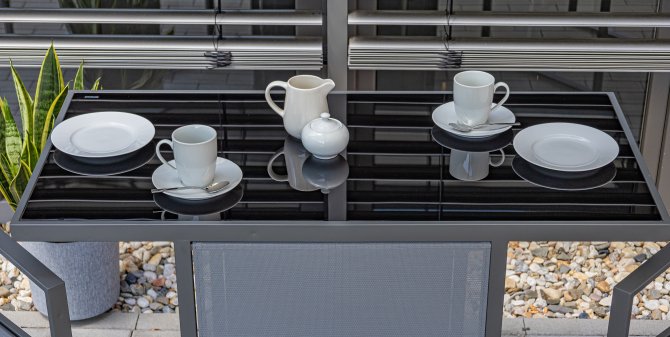 Die Tischplatte aus 5 mm dickem, schwarz bedrucktem Glas ist nicht nur leicht zu reinigen, sondern verleiht dem Set eine elegante Note und rundet das Design harmonisch ab. Um das Set platzsparend zu verstauen, können die Stühle einfach nach vorne geklappt und unter dem Tisch aufbewahrt werden. Dadurch wird dieses Terrassen-Set zur idealen Wahl, selbst für einen sehr kleinen Balkon.