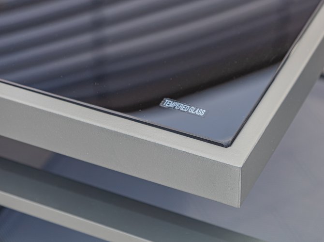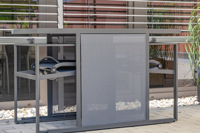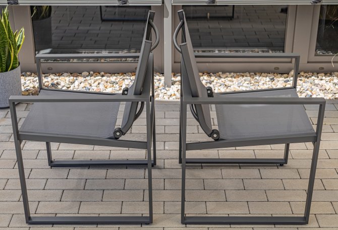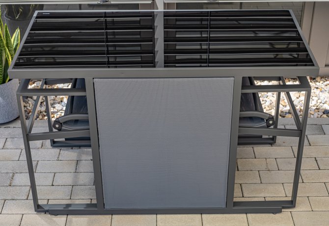 Der robuste Stahlrahmen sorgt für Stabilität und Langlebigkeit, während das graue 2*1 Textilene-Gewebe nicht nur optisch überzeugt, sondern auch wetterfest ist.