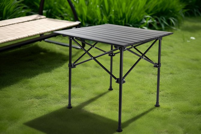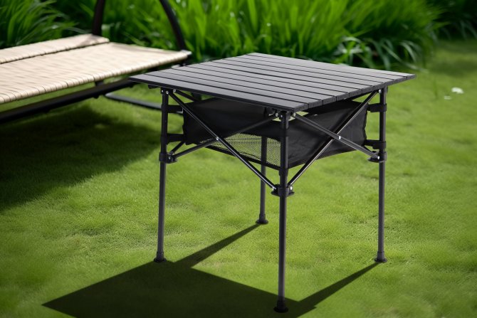 ein zusammenrollbarer Aluklapptisch mit Aufbewahrungsnetz zum Camping oder einfach bei der Rast. Genauso gut auch als Beistelltisch zum Grillen oder auf der Terrasse.