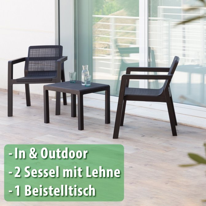 Hochwertige Materialien: Die Sessel und der Beistelltisch sind aus langlebigem, wetterfestem und UV-beständigem Kunststoff in moderner Flechtoptik gefertigt, der seine Farbe auch bei intensiver Sonneneinstrahlung behält.