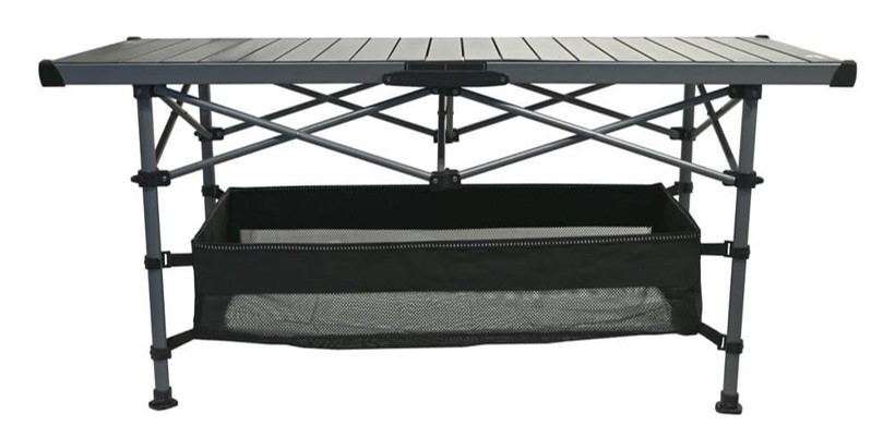 ein großer zusammenrollbarer Aluklapptisch mit Aufbewahrungsnetz zum Camping oder einfach bei der Rast. Genauso gut auch als Beistelltisch zum Grillen oder auf der Terrasse.