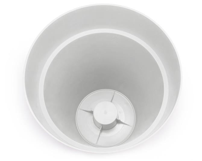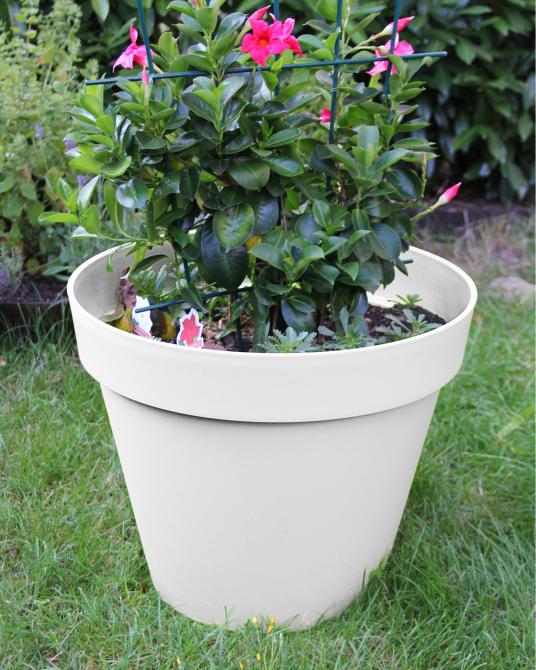 Im Boden befinden sich sechs Stellen zum Durchbohren, sodass das Wasser abfließen kann, sollten Sie ihn draußen einsetzen wollen. Wenn Sie den Pflanzkübel als Übertopf nutzen wollen, wird Ihnen der ca. 11 cm hohe Abstandshalter für einen Wasserspeicher nützlich sein. Bei einem Pflanzvolumen von 76 l ist der Kübel ca. 47 cm hoch und hat am oberen Rand einen Durchmesser von ca. 60 cm, unten einen von ca. 36 cm.