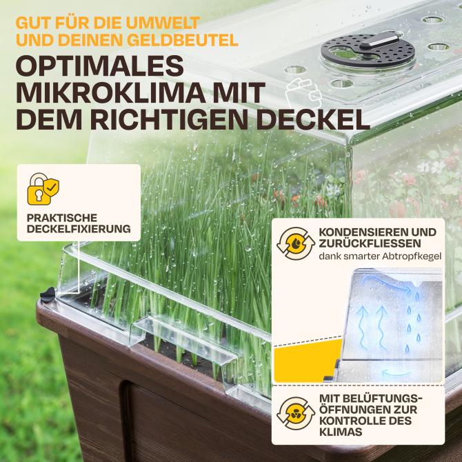Zum Lieferumfang gehören der Deckel, welcher auch einzeln als Mini-Gewächshaus genutzt werden kann. Sowie das klassiche Hochbeet mit passivem Wasserspeicher. Der Deckel verfügt über zwei regulierbare Belüftungsschächte, um das perfekte Mikroklima für Ihre Pflanzen einstellen zu können.