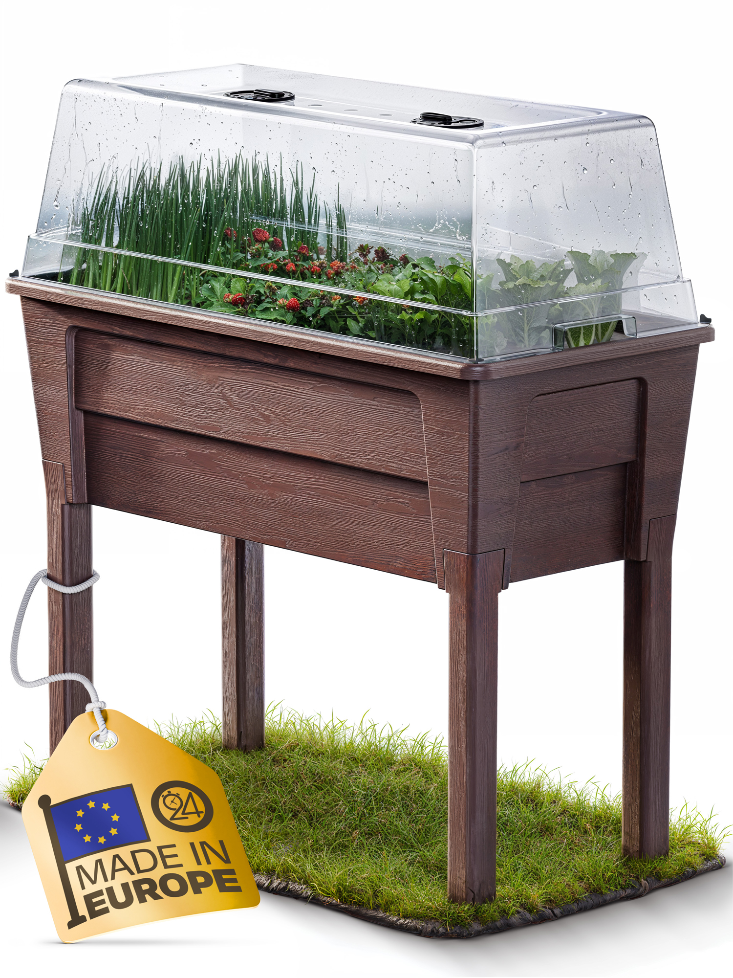 Das Frühbeet ist perfekt für viele verschiedene Kräuter- und Gemüsesorten und noch viele weitere Pflanzenarten wie bespielweise Erdbeeren geeignet. Das moderne eckige Design und ein praktischer Nutzen sind in diesem Hochbeet perfekt vereint. Die ansteckbaren Füße können im Bedarfsfall abgenommen werden, damit überflüssiges Wasser gut abfließen und schädliche Staunässe vermieden werden kann.