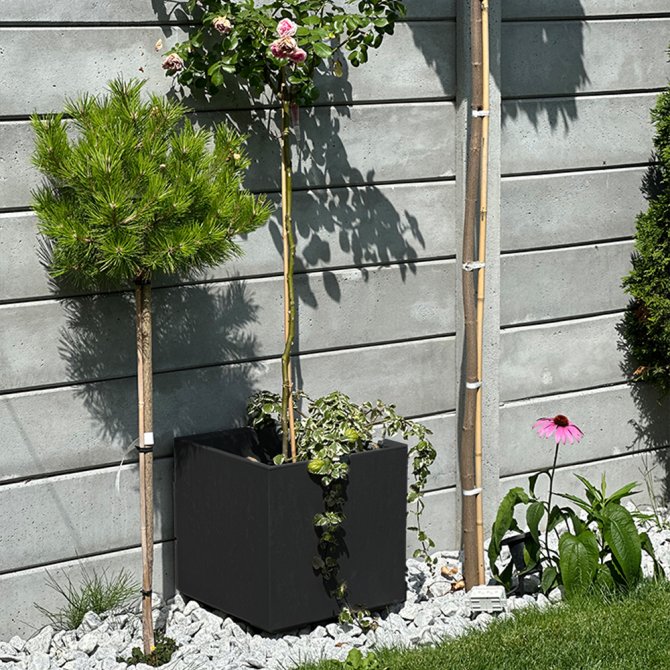 Der Pflanzwürfel Caro 40 ist aus Kunststoff gefertigt, welcher zu 100% recycled wurde. Doch das sieht man der hochwertigen Oberfläche keinesfalls an. Diese ist der Struktur von Beton nachempfunden und wurde mit modernen Elementen ansprechend in Szene gesetzt. Der Pflanzkübel Caro besticht durch seine klaren Linien und fügt sich somit perfekt in moderne Gärten oder Vorgärten ein. Dank des klassischen Designs macht er aber überall eine gute Figur.