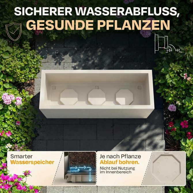 CLEVERER WASSERSPEICHER: Durch Erhöhungen im Boden wird ein Wasserspeicher geschaffen, der die Pflanzerde kontinuierlich mit ausreichend aber nicht zu viel Wasser versorgt, sodass das Gießen vor allem im Sommer lange vorhält. Die besten Ergebnisse erzielt der Speicher wenn die unterste Schicht mit Kies gefüllt wird, bevor Erde aufgebracht wird. Gießt man einmal aus Versehen zu viel, kann das überschüssige Wasser durch die gebohrten Löcher in den Erhöhungen nach außen abfließen. Im Innenbereich empfiehlt sich daher ein Untersetzer oder die Löcher geschlossen zu halten.