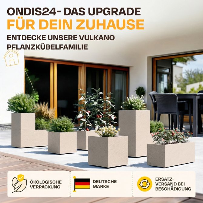 NACHHALTIGE WAHL: Der Blumenkasten Vulkano besteht aus recycelbarem Kunststoff und trägt somit zu einem umweltbewussten Lebensstil bei, ohne Kompromisse bei der Qualität oder Ästhetik einzugehen.