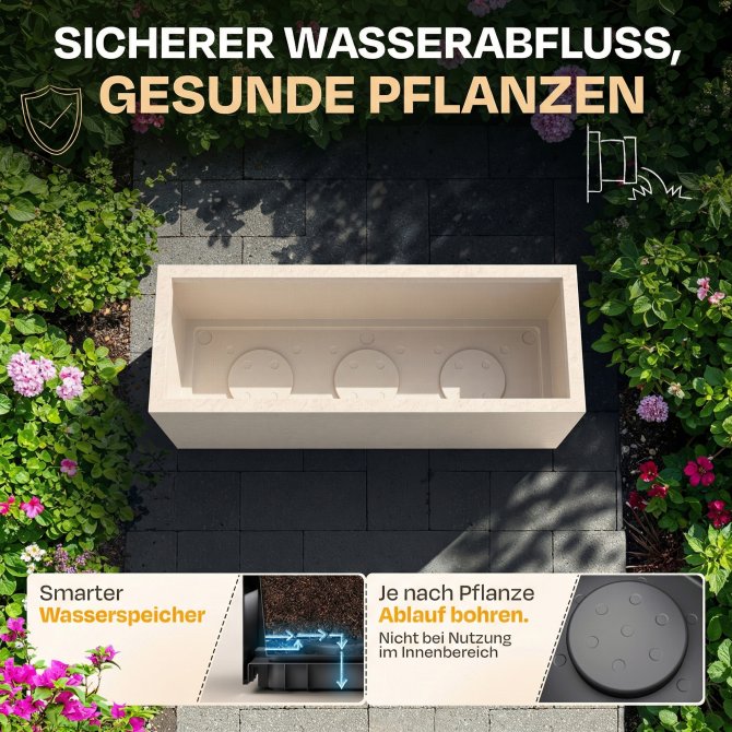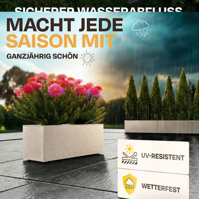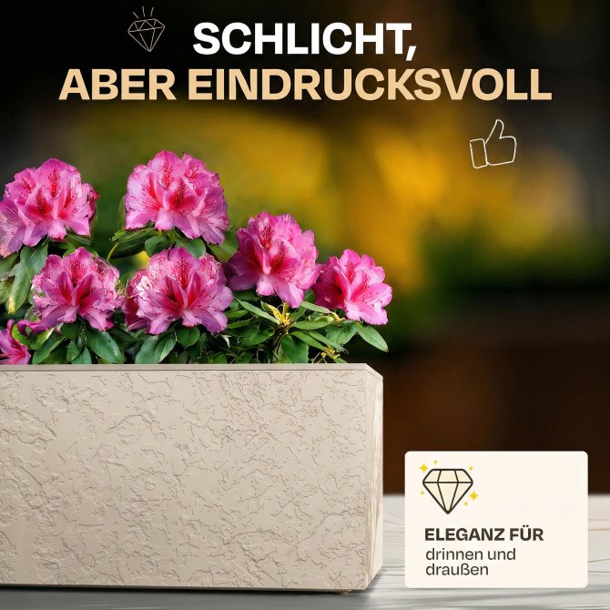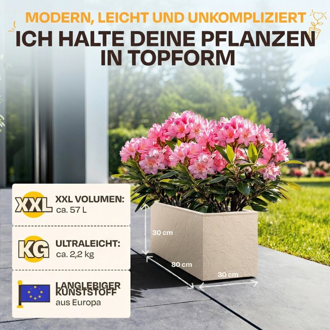 Mit einem kompakten Maß von ca. 79.5 x 29.5 x 29.5 (H) cm und ca. 57 Litern an Pflanzvolumen ist der Pflanzkübel groß genug, um Ihre eigenen Vorstellungen zu verwirklichen, und dennoch er dabei sehr handlich. Bei einem Eigengewicht von ca. 2.2 kg können Sie ihn kinderleicht umstellen. Rot, weiß oder vielleicht doch orange? In diesem Pflanzkübel macht jede Blume eine gute Figur.