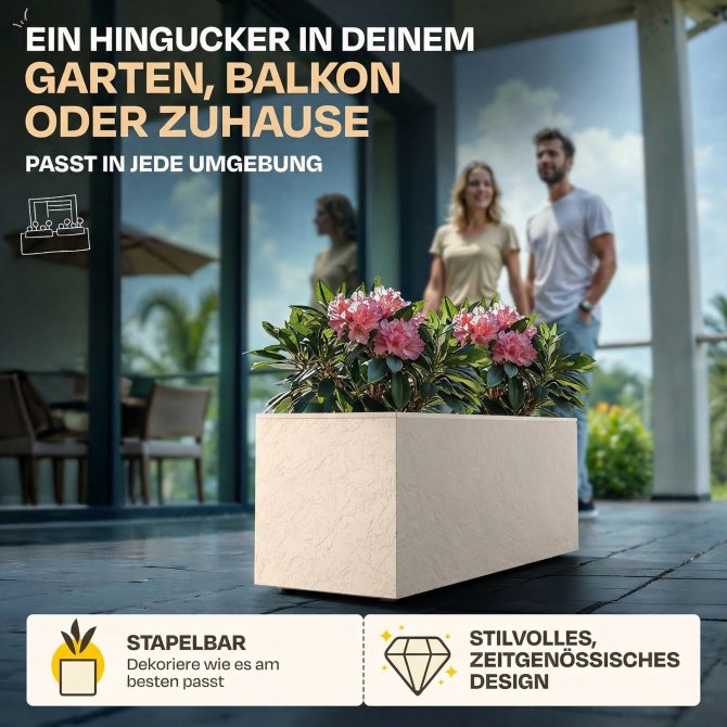 Der Frühling steht vor der Tür – Was gibt es schöneres als seinen Garten mit neuen, farbigen Pflanzen zu dekorieren? Vermutlich nicht viel. Fehlt nur noch der richtige Pflanzkübel, um das moderne Ambiente abzurunden. Mit unserem Vulkan Balkonkasten in einem modernen leinen Design, bieten wir Ihnen einen attraktiven Blumenkübel, um Ihre Balkon oder die heimische Terrasse abzurunden. Die rustikale Gesteinsnachbildung wirkt zudem modern und gleichzeitig zeitlos elegant.