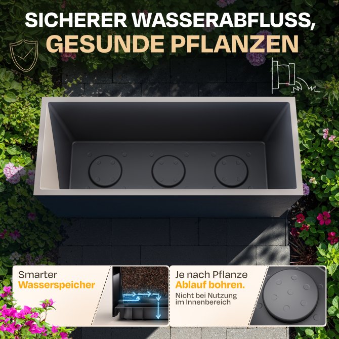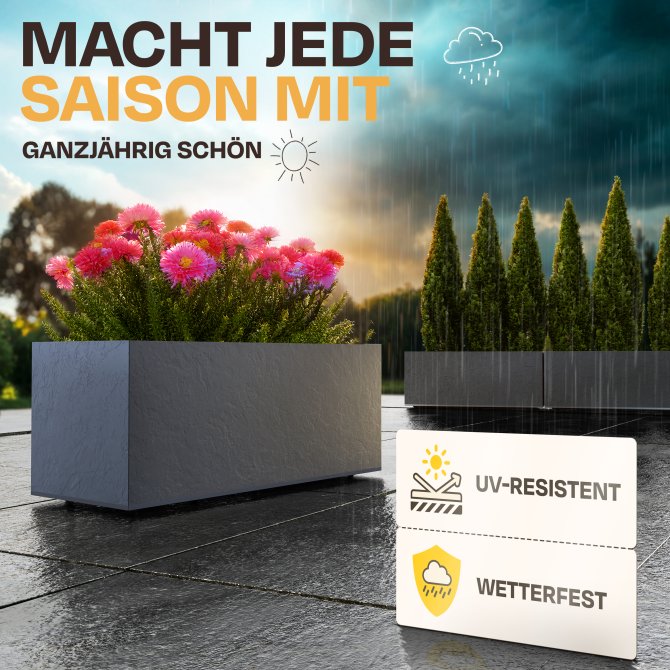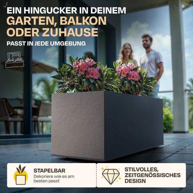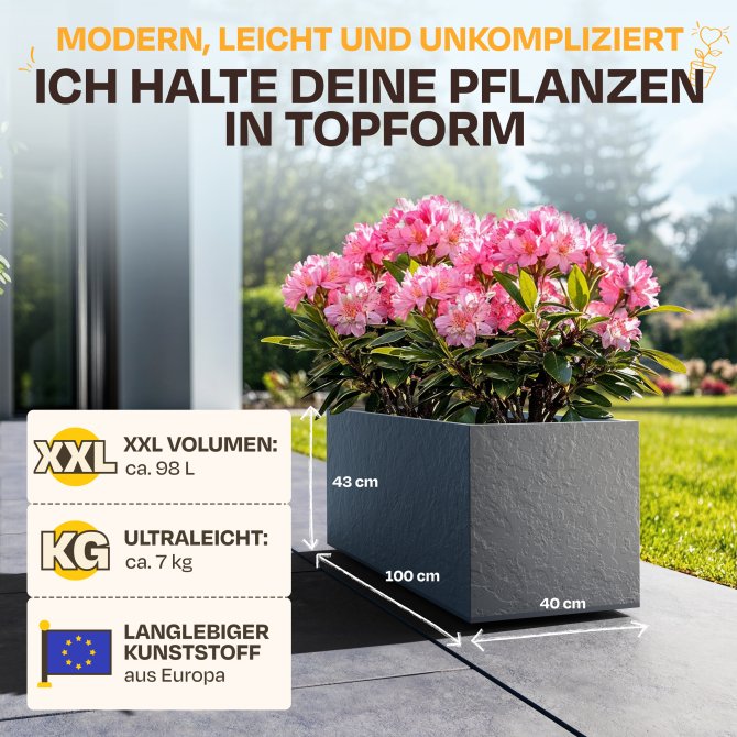 Durch die Größe von ca. 100 x 40 x 43 cm und seine ca. 98 Liter Pflanzvolumen ist der Pflanzkübel Vulkan 100 ideal geeignet für die verschiedensten Blumenzusammenstellungen. So haben Sie genügend Platz, um Ihre eigenen Vorstellungen zu verwirklichen und verschiedenste Arrangements auszuprobieren. Gleichzeitig ist der Pflanzkübel Vulkan 100 auch nicht zu groß.