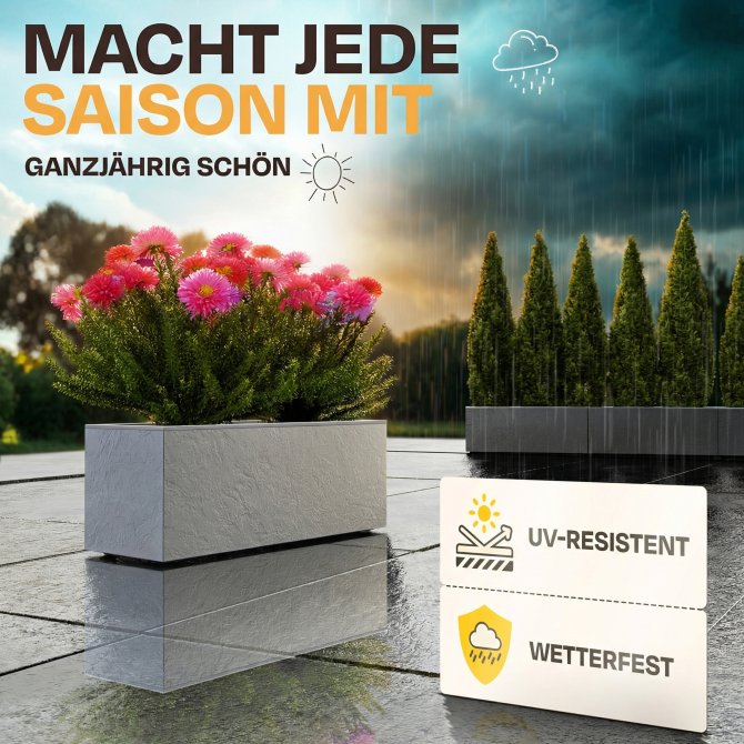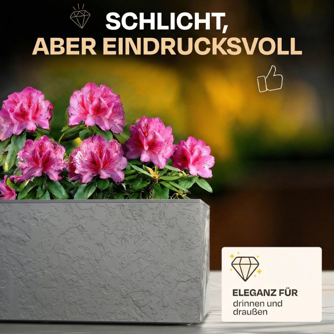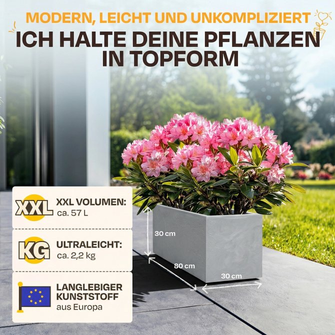 Mit einem kompakten Maß von ca. 79.5 x 29.5 x 29.5 (H) cm und ca. 57 Litern an Pflanzvolumen ist der Pflanzkübel groß genug, um Ihre eigenen Vorstellungen zu verwirklichen, und dennoch er dabei sehr handlich. Bei einem Eigengewicht von ca. 2.2 kg können Sie ihn kinderleicht umstellen. Rot, weiß oder vielleicht doch orange? In diesem Pflanzkübel macht jede Blume eine gute Figur.