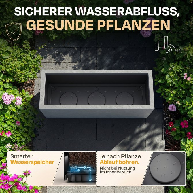 Sie können den Pflanzkübel Vulkan auch im Winter draußen stehen lassen. Der verwendete Kunststoff ist UV – und witterungsbeständig und zudem sehr pflegeleicht und robust. Zudem verfügt dieser Kübel über einen integrierten Wasserspeicher im Boden. Die Löcher hierfür können je nach Bedarf selbst gebohrt werden.