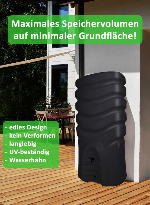 Diese Regentonnen überzeugen nicht nur mit ihrer guten Funktionalität, einer modernen Optik und einer hohen Füllkapazität, sondern auch mit einem hochwertigen Kunststoff Material, welches viele Vorteile mit sich bringt. Da die Regentonne für einen Gebrauch im Freien konstruiert wurde, ist sie sowohl UV-, als auch witterungsbeständig. Der im Material inbegriffene UV-Schutz sorgt für eine langanhaltende Farbe, wodurch Verschleißspuren kaum zu sehen sind. Das moderne Design der Regentonne fällt besonders durch die eingebauten Rippen ins Auge. Diese verhindern, dass die Tonne durch den Wasserdruck verbeult wird. Der Regenspeicher ist in der Farbe anthrazit vorhanden. Da Kunststoff sehr leicht ist, hat auch der Regenspeicher im leeren Zustand bloß ein Gewicht von ca. 20 kg und kann somit einfach transportiert und aufgestellt werden. Sobald Sie einen geeigneten Platz gefunden haben und die Tonne an das jeweilige Fallrohr angeschlossen ist, ist sie einsatzbereit. Das riesige Volumen von 550 Liter reicht vollkommen aus, um Ihren ganzen Garten mit Regenwasser zu versorgen. Diese Füllkapazität ergibt sich aus den Maßen ca. 56 (B) x 79 (L) x 165 (H) cm. Im Zubehör befindet sich zusätzlich ein Auslaufhahn, welcher Ihnen das Befüllen Ihrer Gießkanne erleichtert. Der Hahn wird durch ein integriertes Gewinde angeschraubt und befindet sich auf einer Höhe, sodass darunter eine Gießkanne Platz findet. An einer zweiten Anschlussstelle kann ein Wasserschlauch angeschlossen werden. So schonen Sie Ihren Rücken und erleichtern sich die Gießarbeit. Sollten Sie nun überzeugt sein, bestellen Sie noch heute online Ihren Regenwassertank und sparen Sie bares Geld und schonen Sie die Umwelt.