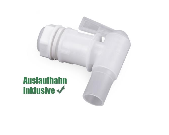 Für die Entnahme des Gießwassers befindet sich ein inklusiver Auslaufhahn im Zubehör, welcher durch ein integriertes Gewinde schnell und einfach angeschlossen werden kann.