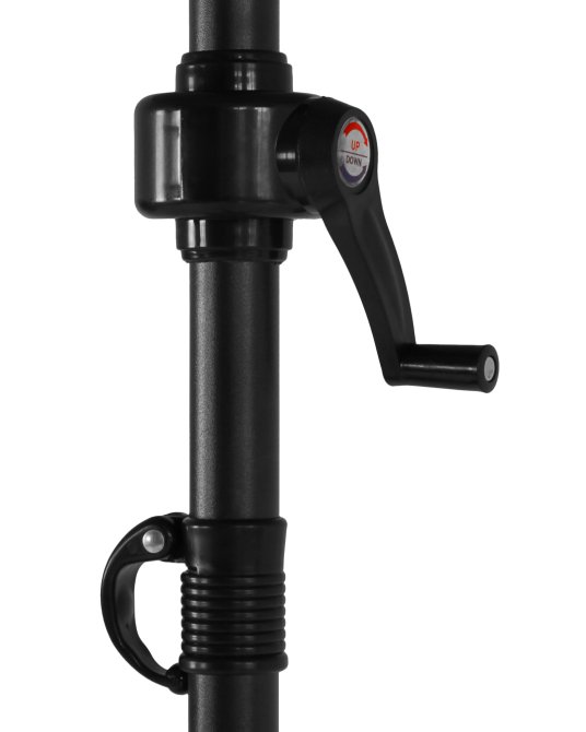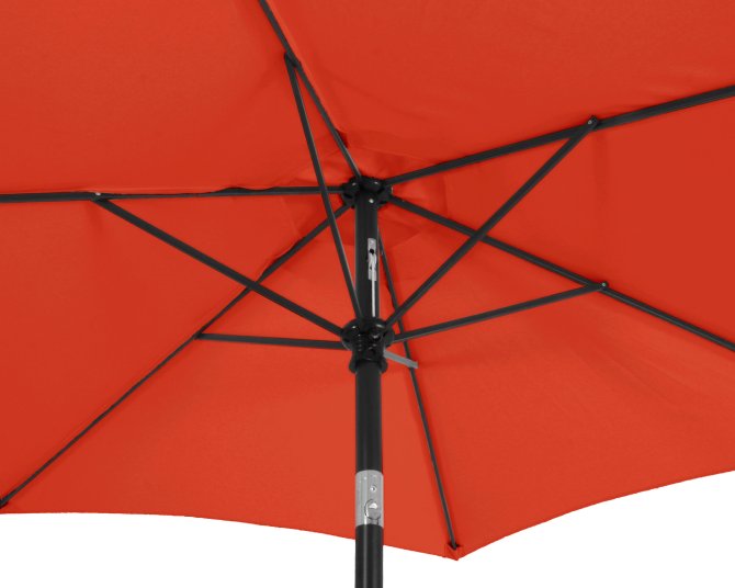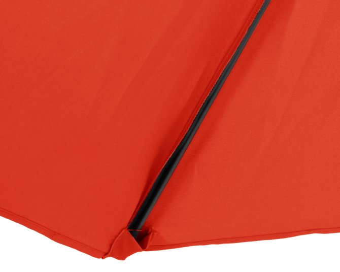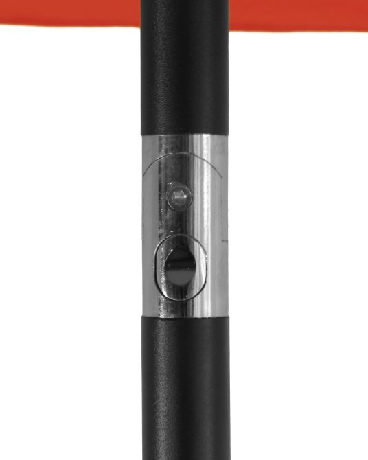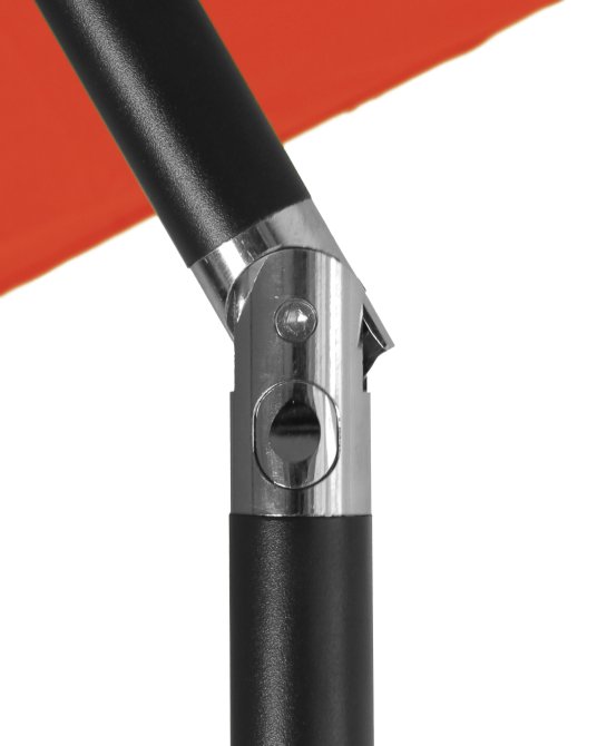 Die leichte Bedienung per Handkurbel ermöglicht ein problemloses Öffnen und Schließen des Marktschirmes. Das dunkelgraue Gestell aus Stahl beinhaltet ein 32 mm dickes Standrohr, welches sechs Streben miteinander verbindet. Der Schattenspender überzeugt mit einem Schirm, welcher aus 100% Polyester besteht. Durch ein verchromtes Knick-Gelenk, welches kinderleicht durch einen Druckknopf zu bedienen ist, lässt sich der Marktschirm individuell einstellen und schützt somit auch vor schräg einfallenden Sonnenstrahlen. Dazu kommt ein UV-Schutz von 50. Der air-vent ist für das Entweichen von leichten Windstößen verantwortlich und sorgt für einen festen Stand. Es kann zusätzlich ein Kreuzständer erworben werden. Es ist dringend zu empfehlen den Ständer mittels der vorgefertigten Bohrungen zu verankern.
