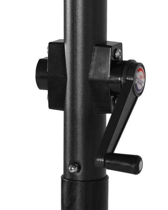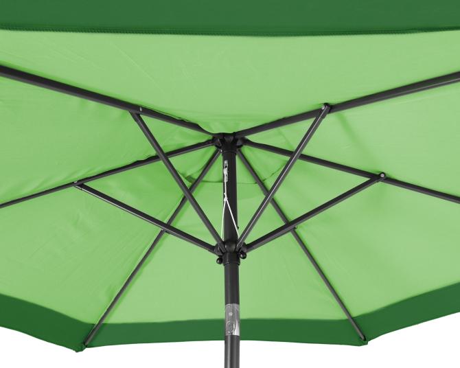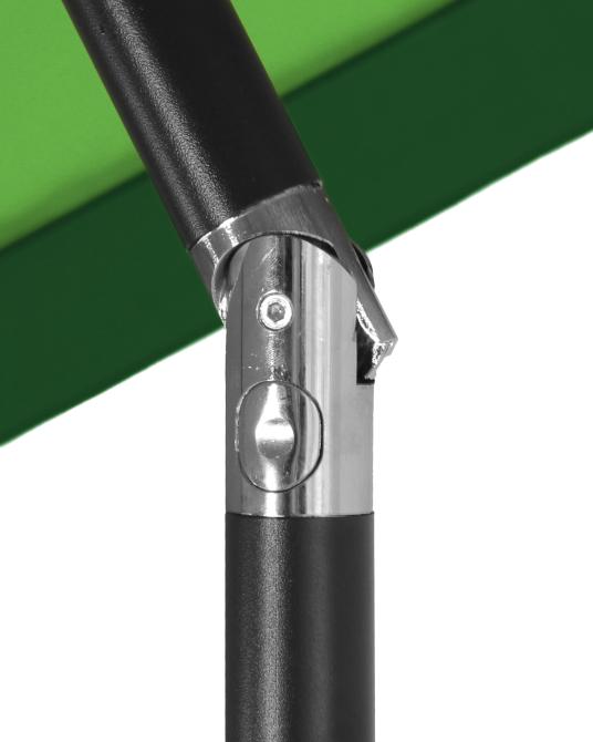 Das dunkelgraue Gestell aus Stahl lässt sich einfach und schnell durch eine Handkurbel aufklappen und genauso schnell wieder schließen. Auf den sechs Streben, welche durch das 38 mm dicke Standrohr verbunden sind, ist der Sonnenschirm gespannt. Er besteht aus 100% Polyester. Dieser Stoff hat dazu einen UV-Schutz von 50. Durch ein eingebautes verchromtes Knick-Gelenk schützt der Marktschirm auch vor schräg einfallenden Sonnenstrahlen. Es ist damit möglich, sich individuell Schatten zu erzeugen. Bei leichten Windstößen verhindert der air-vent, dass der Schirm umkippt und zu schaden kommt. Zusätzlich kann ein Kreuzständer erworben werden, um ein Umkippen des Schirmes zu verhindern. Es ist zu empfehlen, den Kreuzständer mittels der vorgefertigten Bohrungen zu verankern.