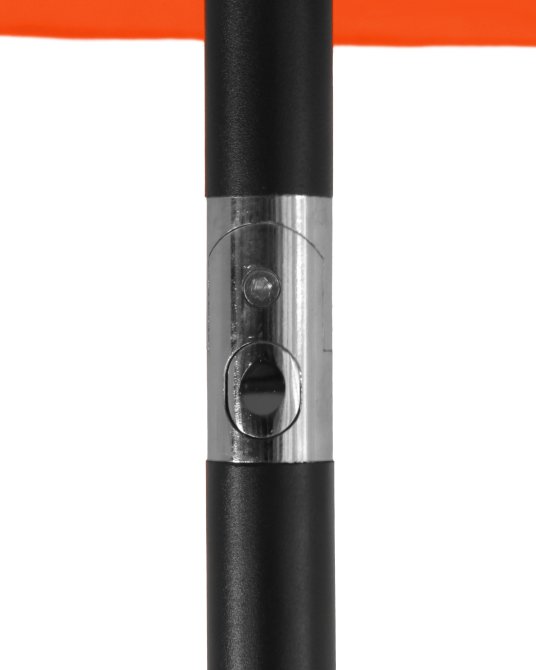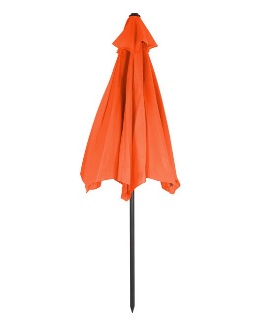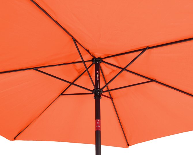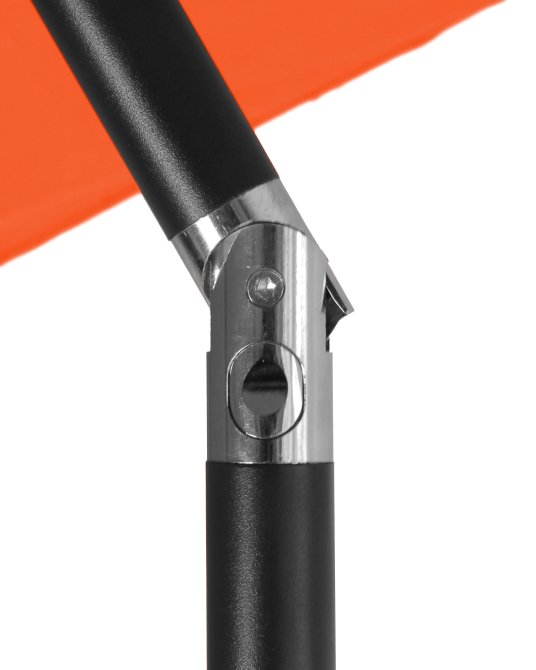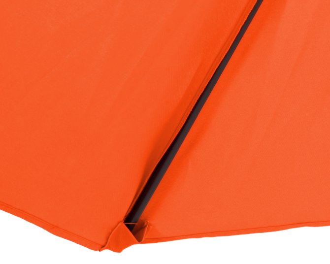Es eine Leichtigkeit den Marktschirm zu öffnen und zu schließen. Das dunkelgraue aus Stahl bestehende Gestell verbindet mit einem 38 mm dicken Standrohr sechs weitere Streben. Auf diesen Streben ist ein Schirm aus 100% Polyester gespannt. Bei schrägem Sonnenlichteinfall hilft ein verchromtes Knick-Gelenk, welches man durch einen Druckknopf betätigt. Es ist somit eine ideale Einstellung des Schirms möglich, um maximalen Schatten zu erlangen. Der Sonnenschirm hat einen UV-Schutz von 50 und einen air-vent. Diese Funktion sorgt dafür, dass leichte Windstöße leicht entweichen können. Damit wird der feste Stand des Marktschirms gesichert.Zusätzlich kann ein Kreuzständer erworben werden, um ein Umkippen des Schirmes zu verhindern. Es ist empfohlen diesen Ständer mittelst der vorgefertigten Bohrungen zu verankern.