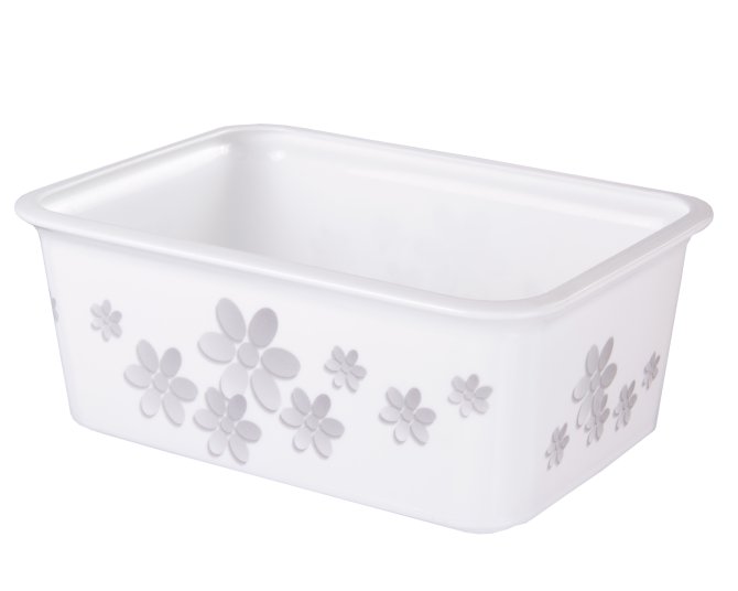 Diese stylischen Aufbewahrungsboxen können Sie in jedem Bereich Ihres Heimes einsetzen. Dank des strukturierten Bodens wird ein sicherer Stand der Boxen gewährleistet, wodurch sie auch in Feuchträumen wie im Badezimmer nicht wegrutschen. Auch in der Küche werden die lebensmittelechten Gefäße schnell zu schicken Helfern. Dass diese Dosen nach oben hin breiter werden, macht sie besonders handlich, auch im Kinderzimmer oder in der Werkstatt. Nicht gebraucht sind die Haushaltsboxen schnell verstaut, denn sie lassen sich ganz einfach ineinander nesten und nehmen auf diese Weise nur wenig Platz ein. Mit den drei verschiedenen Größen und den fünf verschiedenen Motiven ist unter den Moda Boxen sicher für jeden das Passende dabei! Praktisch ist auch, dass sich mit den Boxen in unterschiedlichen Größen ein Turm bauen lässt, sodass Sie ein abgestuftes Regal haben. Das Gefäß hat die Maße ca. 12,5 x 19 x 8 cm.