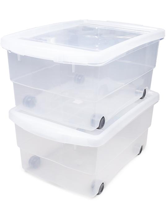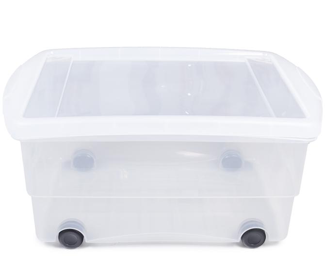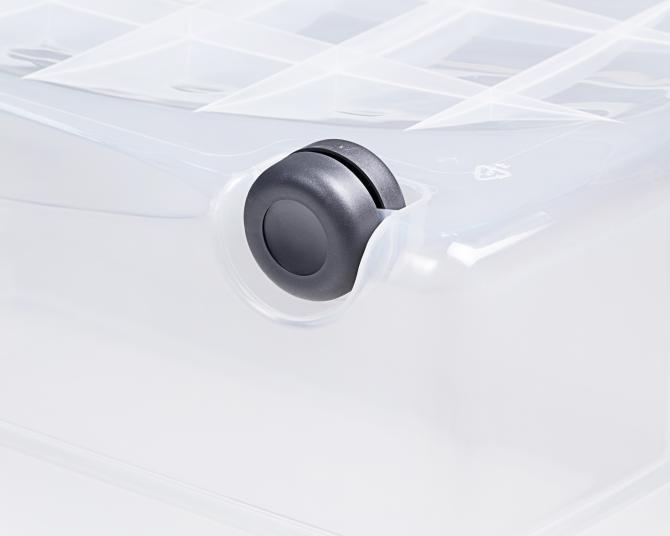 Geräumige, sehr stabile Rollerbox mit transparentem Korpus und 4 fest angebrachten Rollen, transparenter Deckel.