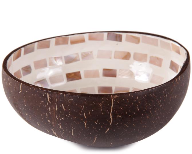 Eine moderne Designer-Schale macht gerade in der Küche und beim Esstisch etwas her. Daher sind diese naturbelassenen Kokosnuss-Schüsseln lebensmittelecht. Die zusätzliche Verzierung wurde handgefertigt und mit größter Sorgfalt aufgebracht, sodass die Schalen aus natürlichen, unschädlichen Stoffen bestehen.