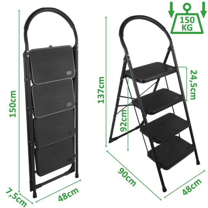 Platzsparend klappbar: Aufgestellt misst die Leiter 48 x 90 x 137 cm (B x T x H). Zusammengeklappt benötigt sie lediglich 48 x 7,5 x 150 cm. So lässt sie sich problemlos in schmalen Nischen verstauen.