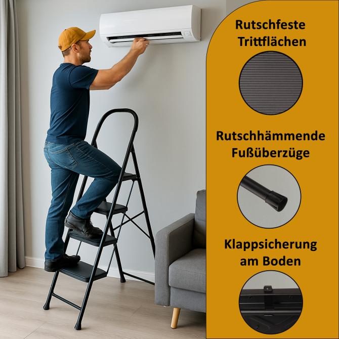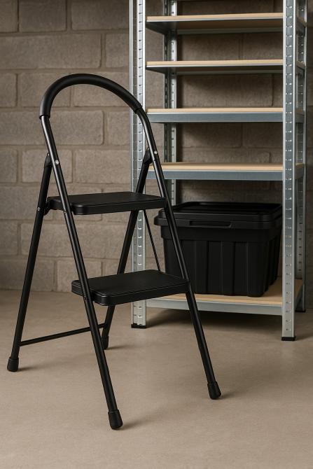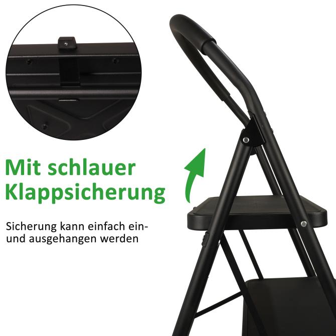 Die schwarze Trittleiter Hugo kombiniert Sicherheit, Komfort und Stabilität. Mit ihren großen Riffelstufen, dem Softgriff, der Sicherheitsverriegelung und dem platzsparenden Design ist sie eine zuverlässige Wahl für alle Aufgaben in höheren Bereichen.