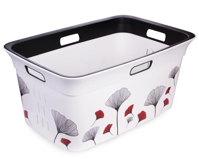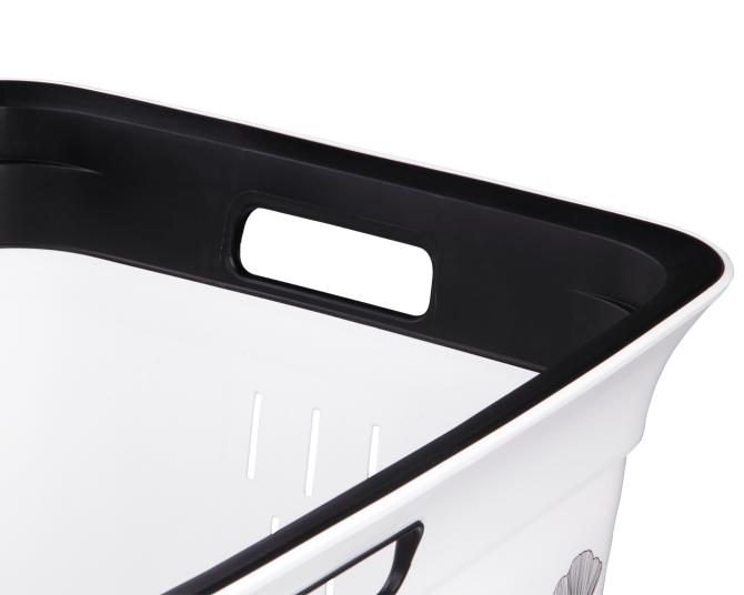 Der Wäschekorb Moda Gingko 45 Liter ist in einer handlichen Größe mit vier praktischen Eingriffsmulden zum Tragen gefertigt. Besonders nützlich sind hierbei die seitlichen Griffe, damit lässt sich der Korb wunderbar unter einem Arm tragen, während man den anderen frei hat. Die Maße betragen ca. 59 x 39 x 27 (H) cm, daraus resultieren 45 Litern Füllvolumen. Damit findet ca. eine Waschmaschinenfüllung Platz. Am Boden misst der Wäschekorb 50,5 x 30 cm. Durch die sich nach unten verjüngende Form kann dieser Korb trotz seines großen Volumens platzsparend verstaut werden. Mehrere Körbe sind entsprechend nestbar. Zusätzlich erleichtert die große Öffnung das Befüllen des Korbes.