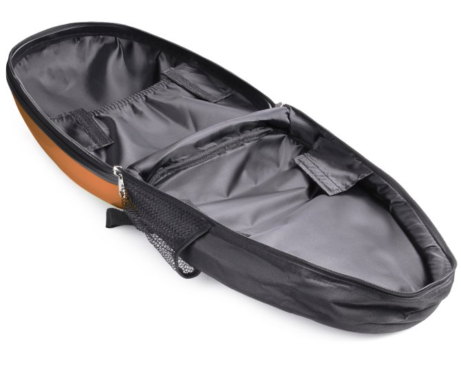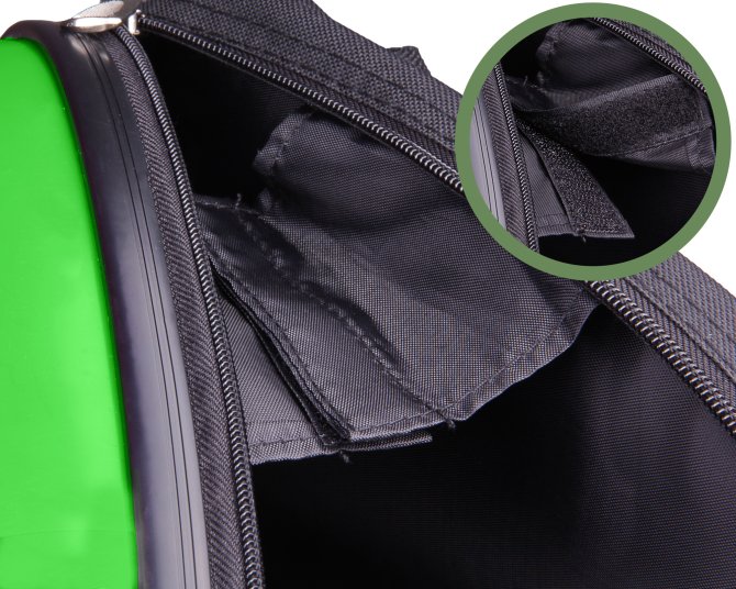 Im Inneren befinden sich zwei Abstandshalter mit Klettverschlüssen. So lässt sich der Rucksack entweder zu etwa einem Drittel öffnen oder man kann die Hartschale um 180 Grad durch den umlaufenden Reißverschluss öffnen. Das pflegeleichte Innenteil aus Nylon lässt sich gut reinigen.
