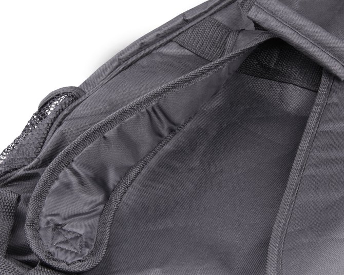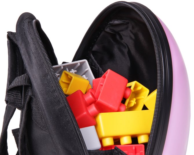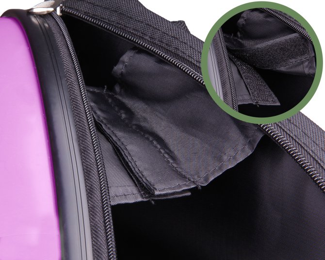 Im Inneren befinden sich zwei Abstandshalter mit Klettverschlüssen. So lässt sich der Rucksack entweder zu etwa einem Drittel öffnen oder man kann die Hartschale um 180 Grad durch den umlaufenden Reißverschluss öffnen. Das pflegeleichte Innenteil aus Nylon lässt sich gut reinigen.