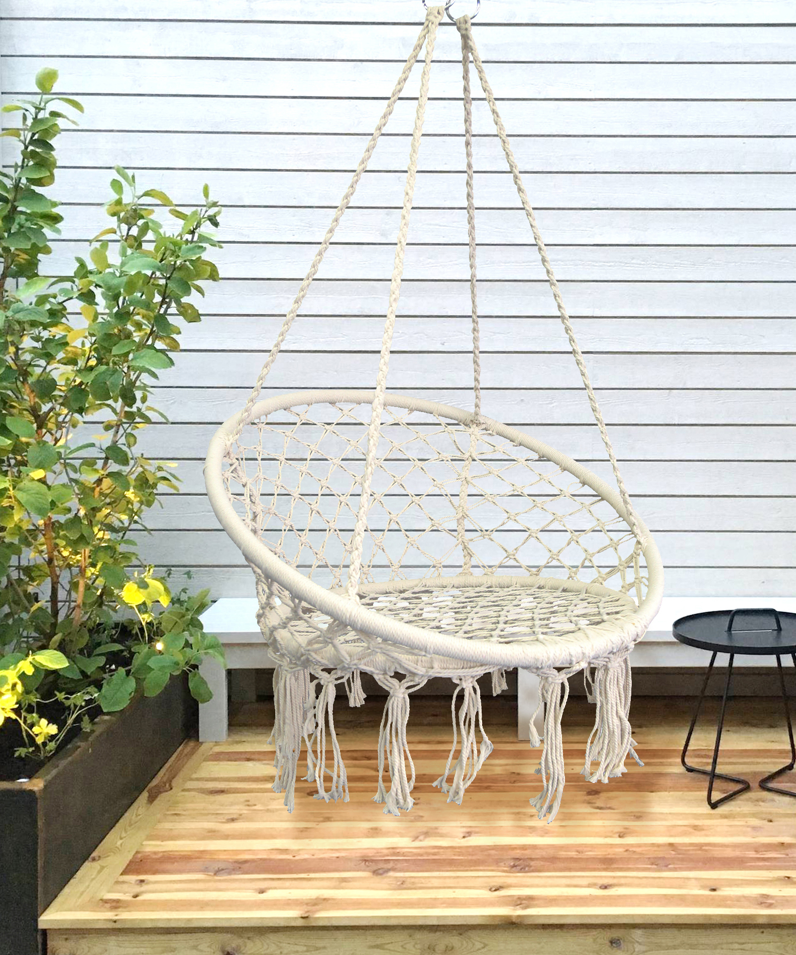 Egal wo, dieser Hängestuhl findet überall seinen Platz ohne Platz wegzunehmen. Durch sein leichtes und handliches Design kann er auch überall mit hingenommen werden. Der Hängesessel wird durch vier Seile mit zwei Stahlringen verbunden und kann so einfach und schnell montiert werden. Man kann ihn auch einfach mal draußen hängen lassen, da er witterungsfest ist, jedoch sollte man ihn aufgrund der Farbe nicht allzu lange im Regen hängen lassen.
