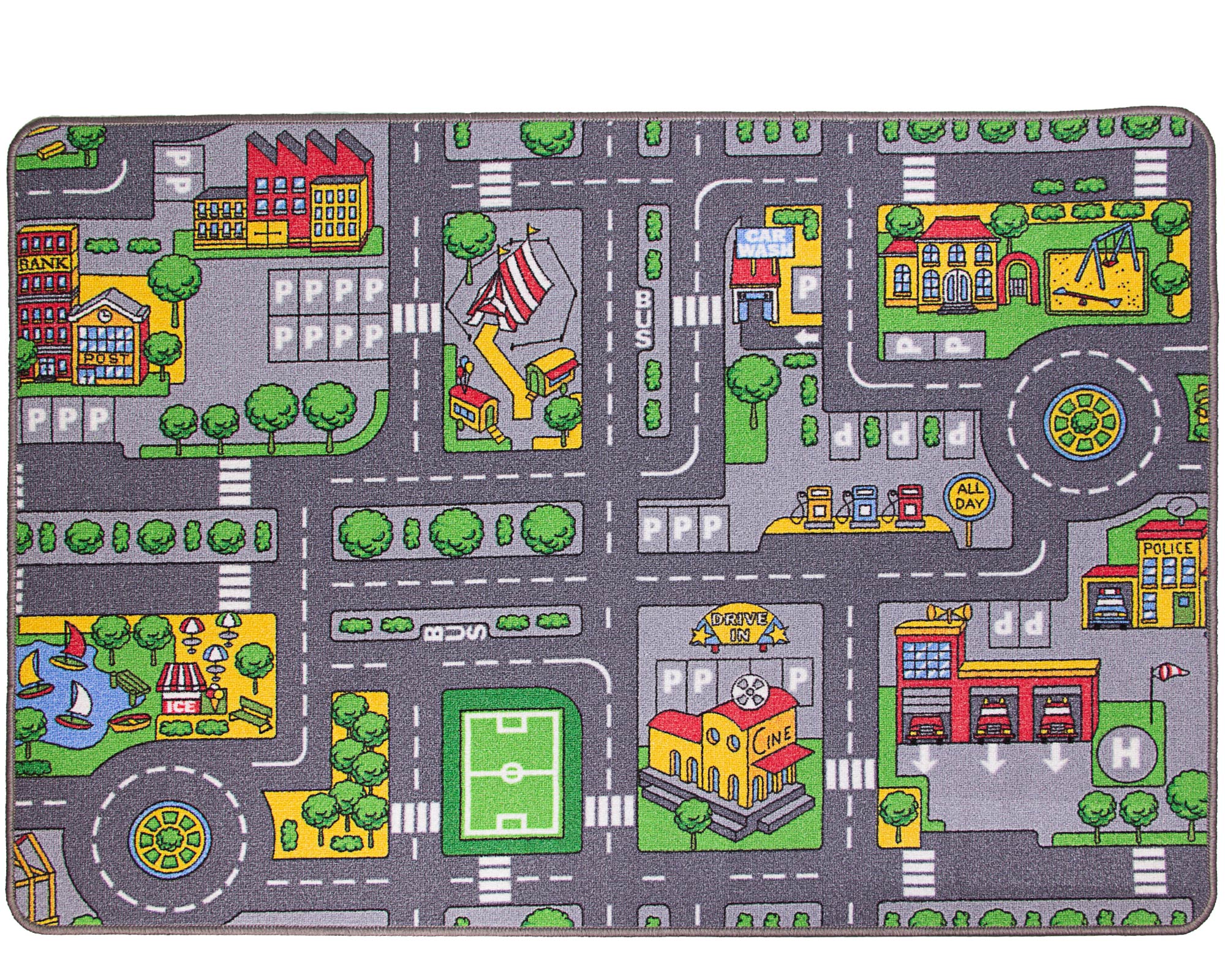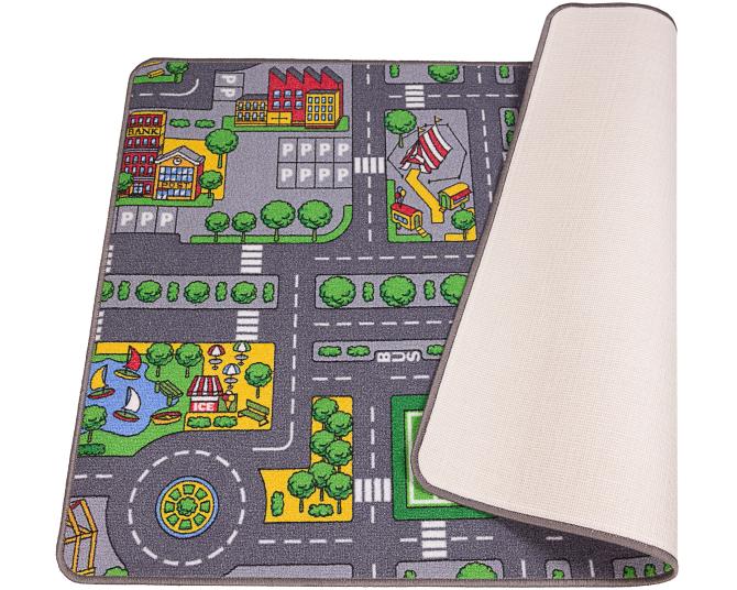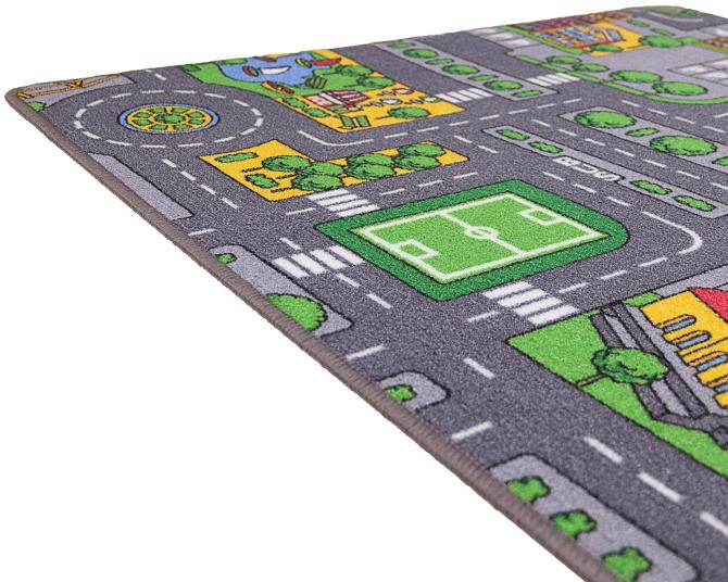 Der Spielteppich überrascht die Kinder mit einer kräftigen Gestaltung. Das umfangreiche Stadt-Motiv auf der einen Seite besticht mit vielen befahrbaren Straßen für alle Spielzeugautos und die interessanten Orte wie Kino, Zirkus, Autowaschanlage und Fußballfeld wecken das Interesse unserer Kleinen.