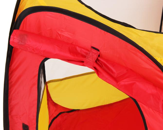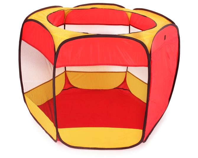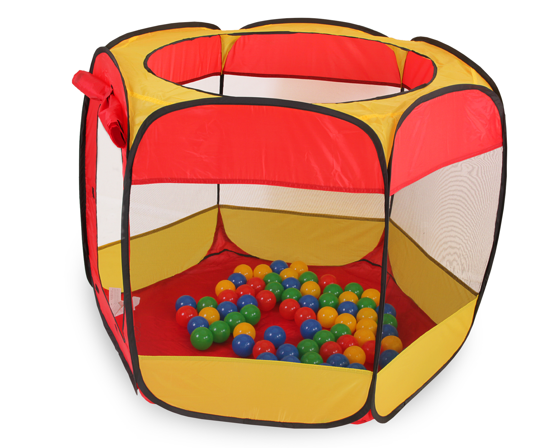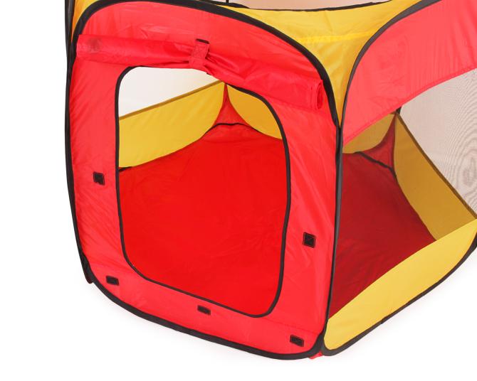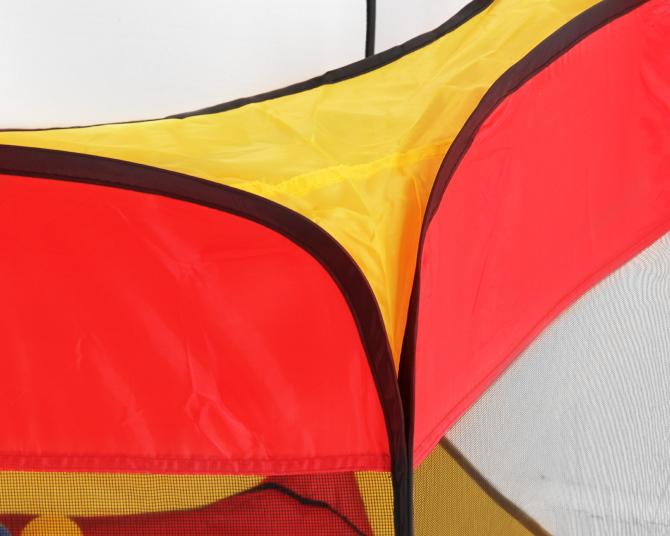 Dieses Wurfzelt entfaltet sich so gut wie von selbst zu seiner vollen Größe, wodurch es sehr leicht auf- und abzubauen ist. Dank der handlichen Tragetasche gestaltet sich auch der Transport ganz einfach. Der erste Eingang des sechseckigen Kinderzeltes befindet sich an einer der Seiten und ist mit Klettverschlüssen ausgestattet, sodass er entweder geschlossen oder zusammengerollt oben gehalten werden kann. Auch die runde Öffnung kann als Ein- und Ausgang benutzt werden. Die restlichen Seiten des Zeltes, welche als Sichtfenster verwendet werden können, weisen Fliegengitter auf, sodass Ihr Kind ungestört von Insekten sowohl drinnen als auch draußen eine Menge Spaß haben kann. Zum Spielzelt gehören außerdem 100 bunte Bälle in den Farben rot, blau, gelb und grün. Mit einem Durchmesser von ca. 6 cm sind diese zu groß, um verschluckt zu werden, sodass Sie sich um die Sicherheit Ihres Kindes nicht sorgen müssen. Besonders schön ist auch, dass mit diesen schwimmenden Badebällen nicht nur im Zelt, sondern auch in der Badewanne oder im Planschbecken prima gespielt werden kann. Dabei schulen die Bälle ganz nebenbei die motorischen Fähigkeiten Ihres Kindes. Holen Sie sich dieses tolle Bälleparadies mit den Abmessungen ca. 100 x 75 (H) cm jetzt günstig zu sich nach Hause! Geeignet ist dieses Produkt für Kinder ab 3 Jahren.