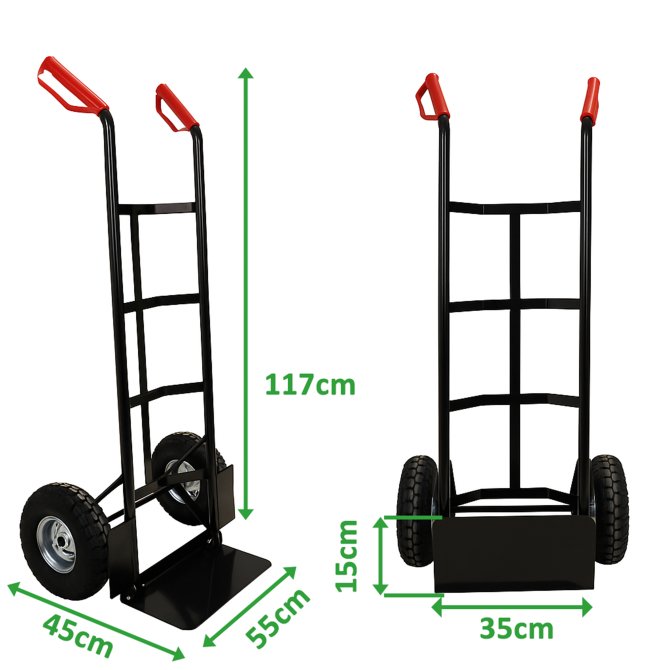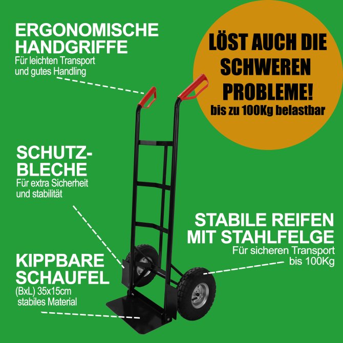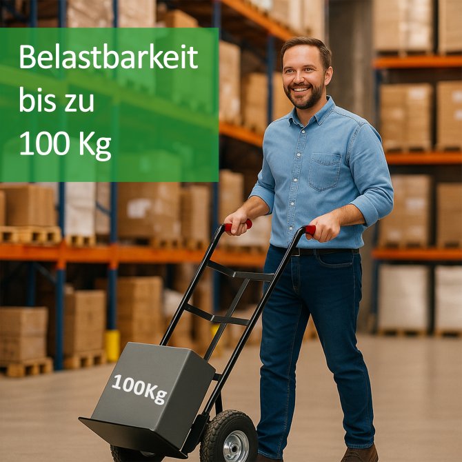 Die Sackkarre Basic 100 kg ist ein zuverlässiger Helfer für den Transport schwerer und sperriger Lasten. Der robuste Stahlrahmen bietet Stabilität, bleibt dabei aber angenehm leicht und gut steuerbar. Die klappbare Schaufel macht die Karre sofort einsatzbereit und ermöglicht eine platzsparende Lagerung. Dank der großen luftbereiften Räder lässt sich die Transportkarre auf nahezu jedem Untergrund mühelos bewegen – auch über Stufen oder Unebenheiten hinweg. Die ergonomischen Sicherheitsgriffe mit Handschutz sorgen für einen festen und komfortablen Halt. Ideal für Umzüge, Haushalt, Garten oder Werkstatt.