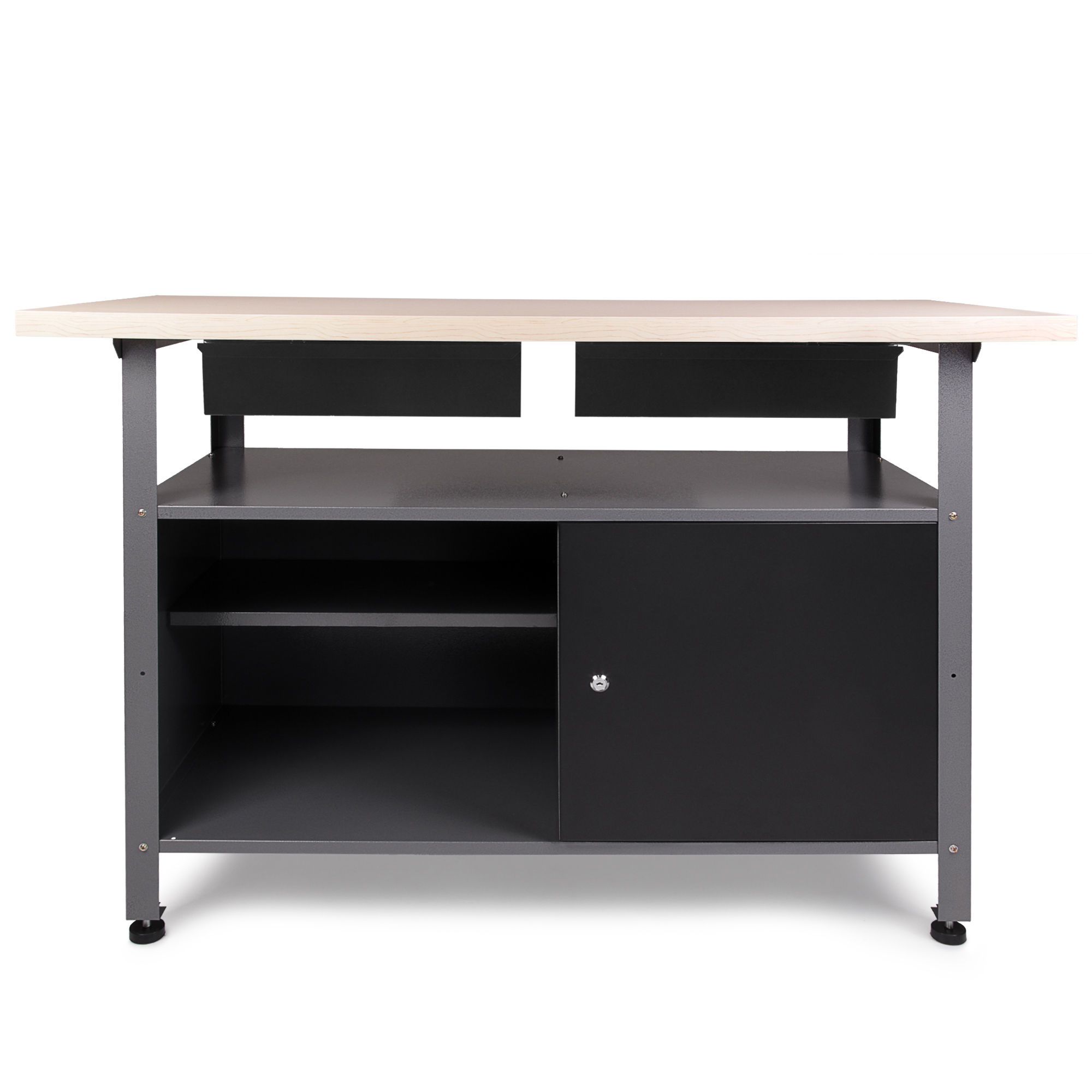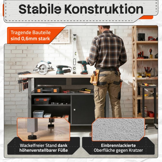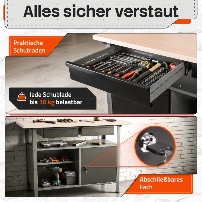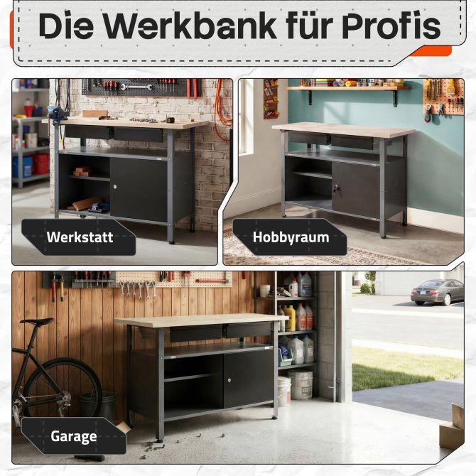 Diese Werkbank vereint alles, was der Heimwerker an Werkbänken schätzt: massive Arbeitsplatte aus Melamin beschichtetem Holz, zwei Schublädenaus Metall unter der Arbeitsplatte und verschiedene Unterbringungsmöglichkeiten für Werkzeug und Zubehör an einem Arbeitsplatz hinter verschließbaerer Tür. So wird Basteln und Bauen zum Vergnügen, anstatt für Frust zu sorgen, weil der Platz in der Wohnung nicht ausreichte oder mit Materialresten auf dem teuren Fußboden gekleckert wurde oder weil der bisherige Tisch in der Garage den Belastungen nicht standhalten wollte.