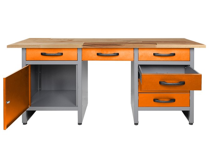 Auf dem Metallschrank ruht die Arbeitsplatte aus Holz: eine 160 cm lange und 28 mm starke Buchenholzarbeitsplatte. Diese hält im Prinzip allem stand und bietet auch genügend Platz für die Werkzeuge, die gerade im Einsatz sind. Die Werkbank kann einer Gesamtbelastung 520 kg standhalten. Insgesamt weist der Handwerkstisch die Maße von ca. 160 (L) x 60 (B) x 85 (H) cm auf und wiegt ca. 80 kg. Die oragene Farbe sorgt für einen Hingucker in jeder Werkstatt.