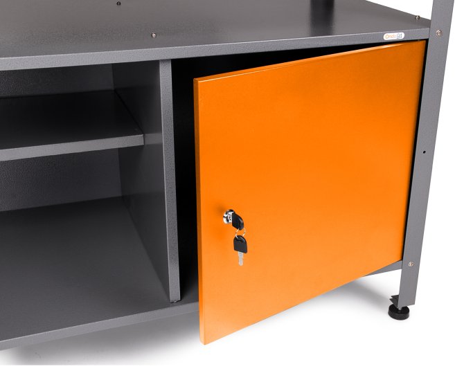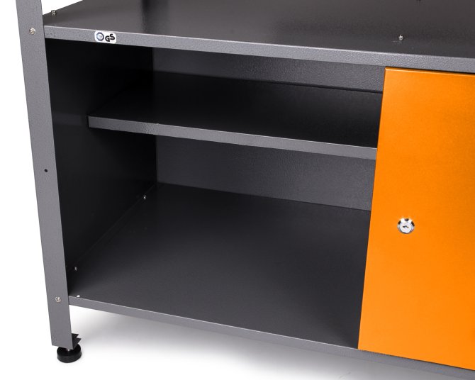 Für die dauerhafte Ablage stehen die beiden Schrankteile zu Verfügung (je ca. 46 x 47 x 42 (H) cm), von denen eine verschließbar ist und vor allem große Werkzeuge beherbergen kann, während das andere Abteil offen ist und über einen Einlegeboden (mit 20 kg Gesamtbelastbarkeit) verfügt.