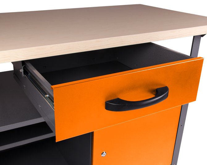 Die Holz-Platte mit Melaminbeschichtung ist äußerst massiv und stabil, darauf kann alles bis zu einer Gesamtbelastung von 380 kg Platz finden. Kleinere Werkzeuge, die nicht im Gebrauch sind, oder auch Papier, können in der Schublade (maximal mit 20 kg belastbar) direkt unter der Arbeitsplatte untergebracht werden. So sind sie immer griffbereit, liegen aber nicht auf dem Arbeitstisch im Weg herum.