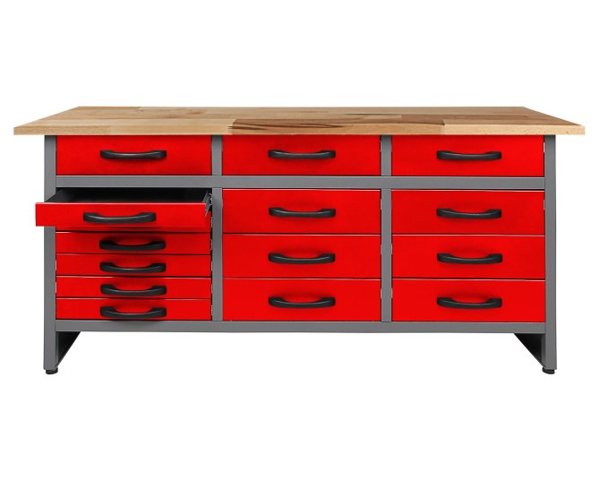 Unter der Holz-Platte befinden sich 15 Schubladen (mit jeweils bis zu 20 kg belastbar) in 2 verschiedenen Größen. Dadurch können Sie verschiedenste Werkzeuge, Schrauben, Nägel und Zubehör lagern und nichts kommt durcheinander. Ewiges Suchen nach dem passenden Werkzeug oder der passenden Schraube wegen zu weniger Schubladen gehört der Vergangenheit an - Sie verlieren nie die Übersicht. Dabei geht jede einzelne Schublade leicht auf und zu, dafür sorgen Kugellagerung und Führungsschienen. Die rote Farbe der Werkbank wirkt dabei edel und optisch ansprechend. Der spezielle Lack sorgt außerdem für Resistenz gegenüber Kratzern und der Feuchtigkeit.