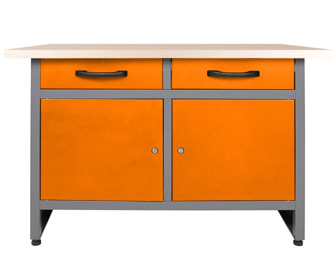 Die Werkbank Werner besitzt die Maße von ca. 180 x 60 x 85 (H) cm und weist eine äußerst starke 32 mm Holzarbeitsplatte auf, ummantelt von einer Schicht Melaminharz, auf. Die Werkbank Werner verfügt aus zwei verschiedenen Elementen. Zum einen aus zwei großräumigen Schubladen (je ca. 43 x 43 x 13 (H) cm), zum anderen zwei verschließbare Schrankteile (je ca. 46 x 47 x 42 (H) cm). Mithilfe dieser Stauraumfächer lassen sich Werkzeug und Werkstattzubehör sicher und einfach verstauen. Höhenverstellbare Füße sorgen für einen stabilen Stand sowie für ein bequemes Arbeiten auf der Werkbank Werner. Der Metallkorpus ist neben einem modernen Design auch durch seine Resistenz gegen Kratzern und Feuchtigkeit charakterisiert.