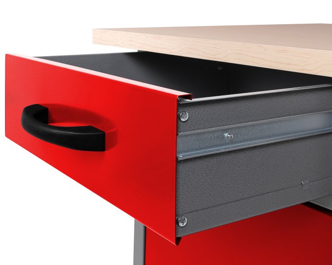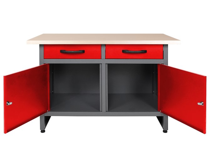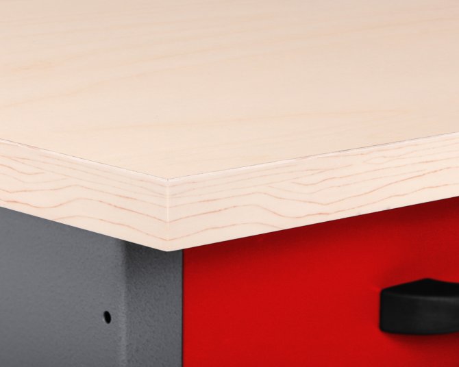 Die Werkbank Werner besitzt die Maße von ca. 180 x 60 x 85 (H) cm und weist eine äußerst starke 32 mm Holzarbeitsplatte auf, ummantelt von einer Schicht Melaminharz, auf. Die Werkbank Werner verfügt aus zwei verschiedenen Elementen. Zum einen aus zwei großräumigen Schubladen (je ca. 43 x 43 x 13 (H) cm), zum anderen zwei verschließbare Schrankteile (je ca. 46 x 47 x 42 (H) cm). Mithilfe dieser Stauraumfächer lassen sich Werkzeug und Werkstattzubehör sicher und einfach verstauen. Höhenverstellbare Füße sorgen für einen stabilen Stand sowie für ein bequemes Arbeiten auf der Werkbank Werner. Der Metallkorpus ist neben einem modernen Design auch durch seine Resistenz gegen Kratzern und Feuchtigkeit charakterisiert.