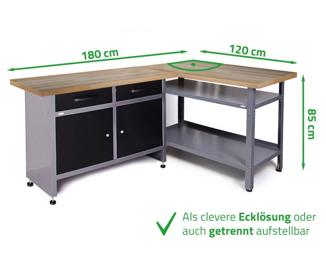 Simply Clever: Ecklösung - und sonst nichts! Kein Zubehör, kein Schnick-Schnack. Einfacher Problemlöser für die ungenutzte Ecke in deiner Werkstatt. Die günstige Lösung den Platz in deiner Werkstatt optimal auszunutzen. Du hast schon Lochwände, Haken und Hängeschränke in Deinem Hobbyraum und suchst einfach nur eine günstige Eck-Werkbank, sonst nichts? Dann spare Platz und Geld zugleich mit dem Werkstatt-Set Ecklösung "Sparfuchs". Dank den offenen Ablagefächern ist der Stauraum in der Ecke weiterhin uneingeschränkt nutzbar. Keine komplizierte Eck-Ergänzung oder Montage. Ecklösung mit zwei Werkbänken, die auch einzeln nutzbar wären - zum unschlagbaren Set-Preis. Maße ca. 160 x 120 x 85 (H) cm, Justierfüße, Wandmontage, 1 kugelgelagerte Schublade, 1 abschließbare Tür, Buchenholzplatte (28mm stark), praktischer Paketversand in nur drei Paketen, Selbstmontage in 1-2 Stunden.