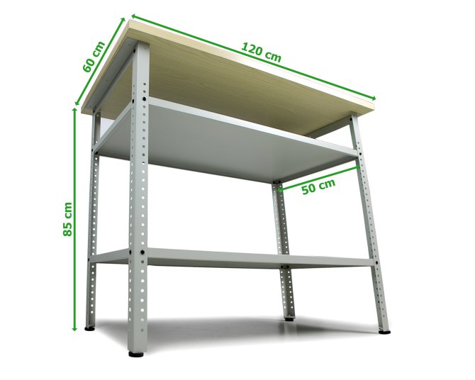 Die Werkbank besitzt Füße mit Höhenverstellung, damit etwaige Unebenheiten problemlos ausgeglichen werden können und die Werkbank einen sicheren Stand hat. Die beiden Zwischenböden verleihen der Werkbank nicht nur ihre Stabilität sondern bieten auch jede Menge Stauraum, der effektiv genutzt werden kann. Außerdem lassen sich die Fachböden individuell einsetzen und können in den vorgebohrten Löchern je nach Wunsch angebracht werden. Durch die offene Konstruktion kann man verstaute Utensilien sofort und in einem Handgriff entnehmen. Die Werkbank wird demontiert geliefert. Ein allround- Heimwerker hat keine Probleme beim Zusammenbau dieses Werktisches. Für den Aufbau sollte man etwa 15-20 Minuten einplanen und schrittweise nach der Anleitung vorgehen. Alle nötigen Zubehörteile und eine Aufbauanleitung sind natürlich im Paket enthalten, auch Werkzeug wird im Paket mitgeliefert. Zu dieser Werkbank haben wir ebenfalls passende Werkzeugschränke und Lochwände im Programm. Die Maße der Werkbank sind 120 (B) x 85 (H) x 60 (T) cm und wiegt ca. 20 KG.