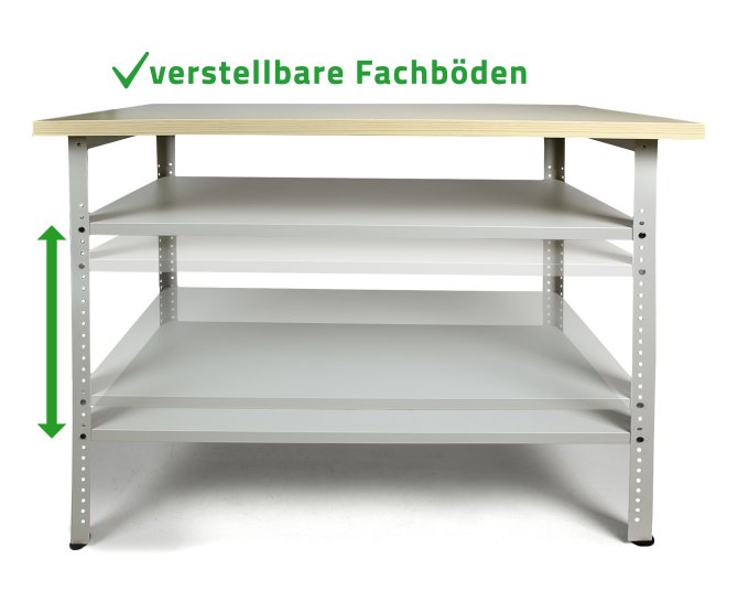 wurde mit einer Melaminbeschichtung überzogen und weist eine Stärke von 32 mm auf - dadurch ist sie top-solide! Der Werktisch aus Holz und Metall ist mit bis zu 320 kg belastbar. Trotzdem ist diese Werkbank mit nur ca. 28,5 kg Eigengewicht unsere leichteste Werkbank und lässt sich so ohne große Mühe umstellen. Kleine Unebenheiten im Boden können Sie durch die höhenverstellbaren Füße mühelos ausgleichen.Unter der Arbeitsplatte befinden sich zwei große Ablageflächen (Gesamtbelastbarkeit jeweils 80 kg), wo sperriges Werkzeug oder Geräte wie Gießkannen und Bohrmaschinen untergebracht werden können. Die beiden Zwischenböden sind jeweils ca. 100 x 47,5 cm groß und verleihen dem Werktisch nicht nur mehr Stabilität, sondern bieten auch jede Menge Stauraum, der effektiv genutzt werden kann. So können Sie gerade nicht verwendete Werkzeuge einfach beiseitelegen und müssen sich bei der Arbeit nicht stören lassen. Den Arbeitsplatz können Sie voll und ganz nutzen.