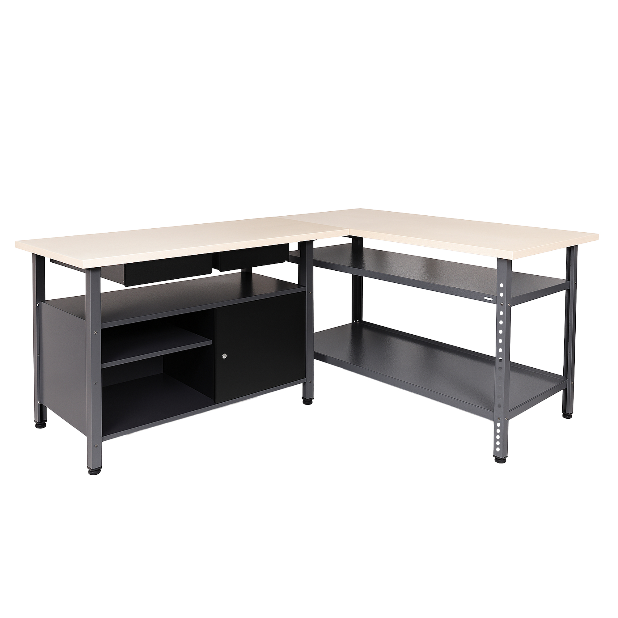 Simply Clever: Ecklösung - und sonst nichts!Kein Zubehör, kein Schnick-Schnack. Einfacher Problemlöser für die ungenutzte Ecke in deiner Werkstatt. Die günstige Lösung den Platz in deiner Werkstatt optimal auszunutzen. Du hast schon Lochwände, Haken und Hängeschränke in Deinem Hobbyraum und suchst einfach nur eine günstige Eck-Werkbank, sonst nichts? Dann spare Platz und Geld zugleich mit dem Werkstatt-Set Ecklösung "Sparfuchs" Dank den offenen Ablagefächern ist der Stauraum in der Ecke weiterhin uneingeschränkt nutzbar. Keine komplizierte Eck-Ergänzung oder Montage. Ecklösung mit zwei Werkbänken, die auch einzeln nutzbar wären zum unschlagbaren Set-Preis. Maße ca. 160 x 120 x 85 (H) cm, Justierfüße, Wandmontage, 1 kugelgelagerte Schublade, 1 abschließbare Tür Melaminbeschichtete Arbeitsplatten (32mm stark), perfekt ebene Oberfläche, leicht zu reinigen, praktischer Paketversand in nur drei Paketen, Selbstmontage in 1-2 Stunden.