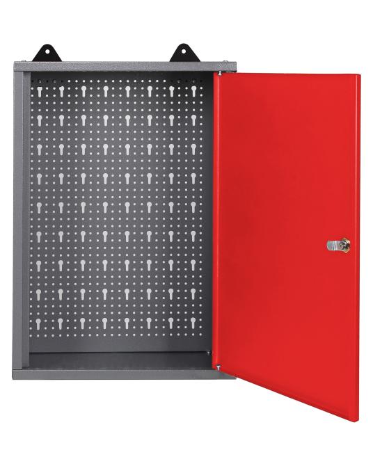Der Werkzeugschrank Tim besitzt die Maße von ca. 42 x 20 x 60 (H) cm und wiegt nur erstaunliche 6 kg. Insgesamt kann dieser Schrank bis zu 30 kg tragen – genug für viele Werkzeuge. Die Rückwand des Schranks besteht aus einer Euro-Lochwand, an dieser lassen sich Haken platzieren, um Werkzeuge und weiteres Zubehör einzuhängen. Der Werkzeugschrank ist durch die großen stabilen Aufhängungen leicht und sicher an der Wand zu befestigen.