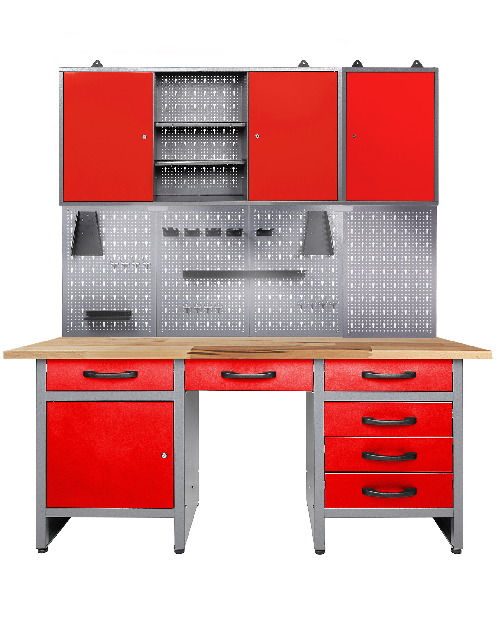Werkstatteinrichtung 160 cm - Arbeitshöhe 85 cm - bestehend aus 1 x Werkbank (Harry), 2 x Werkstattschrank (42 cm / 120 cm), 4 x Lochwand, 1 x Lochwandhaken-Set, 2x LED, rot