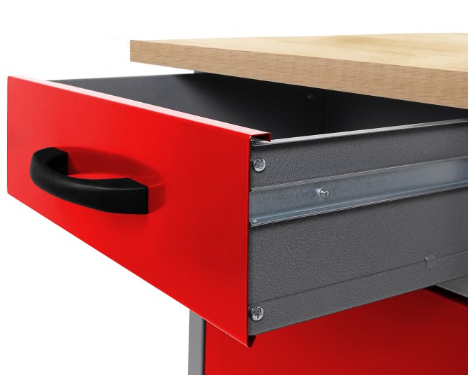 Die Werkbank Harry mit den Maßen von ca. 160 x 60 x 85 (H) cm besitzt eine stabile 160 cm lange Holzplatte. Diese weist eine Stärke von 28 mm auf und ist aus hochwertigem Buchenholz verleimt - dadurch ist sie top-solide! Insgesamt sechs Schubladen bieten ausreichend Stauraum für Werkzeug und Kleinteile. Diese lassen sich ganz einfach mit den kugelgelagerten Führungsschienen schieben. Mithilfe des verschließbaren Schrankteils lässt sich auch großes Werkstattzubehör wie eine Bohrmaschine, Kabeltrommel und ein Schleifgerät sicher und einfach verstauen. Höhenverstellbare Füße sorgen für einen stabilen Stand sowie für ein bequemes Arbeiten auf der Werkbank Harry. Der Metallkorpus ist neben einem modernen Design auch durch seine Resistenz gegen Kratzern und Feuchtigkeit charakterisiert.
