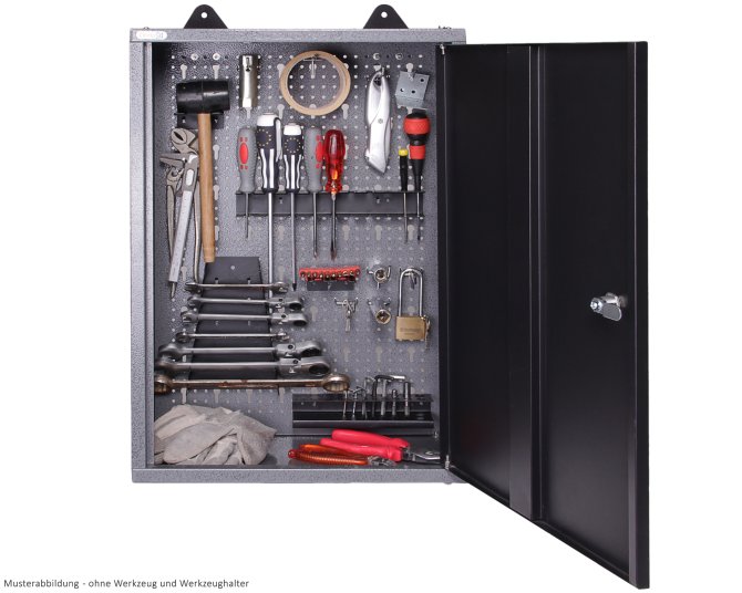 Der Werkzeugschrank Tim besitzt die Maße von ca. 42 x 20 x 60 (H) cm und wiegt nur erstaunliche 6 kg. Insgesamt kann dieser Schrank bis zu 30 kg tragen –genug für viele Werkzeuge. Die Rückwand des Schranks besteht aus einer Euro-Lochwand, an dieser lassen sich Haken platzieren und Werkstattgeräte wie Bohrmaschine, Fräser und Schleifgerät einhängen. Der Werkzeugschrank ist durch die großen stabilen Aufhängungen leicht und sicher an der Wand zu befestigen. Der Metallkorpus ist neben einem modernen Design auch durch seine Resistenz gegen Kratzern und Feuchtigkeit ausgezeichnet.